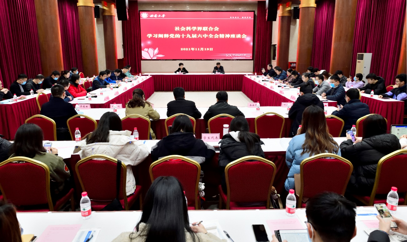 11月19日上午,学校社科联召开学习阐释党的十九届六中全会精神座谈会,就党的十九届六中全会精神进行学习、宣传、研究、阐释。人文社科专家代表、挂靠我校的市级学会代表、民主党派专家代表、师生代表等六十余人参加会议。学校党委副书记潘洵出席会议并进行导学。会议由学校bw必威西汉姆联官网界联合会主席黄蓉生主持。