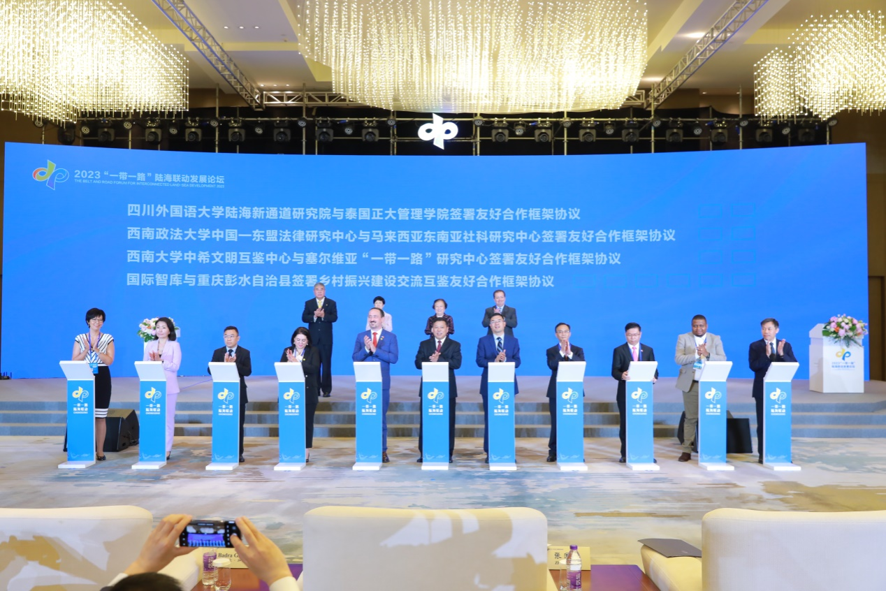 5月17日,由“一带一路”智库合作联盟和重庆市人民政府主办,中联部当代世界研究中心和市政府外办承办的2023“一带一路”陆海联动发展论坛在重庆开幕,来自“一带一路”合作伙伴国家的政党政要、智库学者、高校代表、工商界人士200余人参加本次论坛。校长张卫国参加论坛并代表中希文明互鉴中心与塞尔维亚“一带一路”研究中心签署《bw必威西汉姆联官网中希文明互鉴中心与塞尔维亚“一带一路”研究中心友好合作框架协议》。中共中央政治局委员、重庆市委书记袁家军出席开幕式并致辞。
