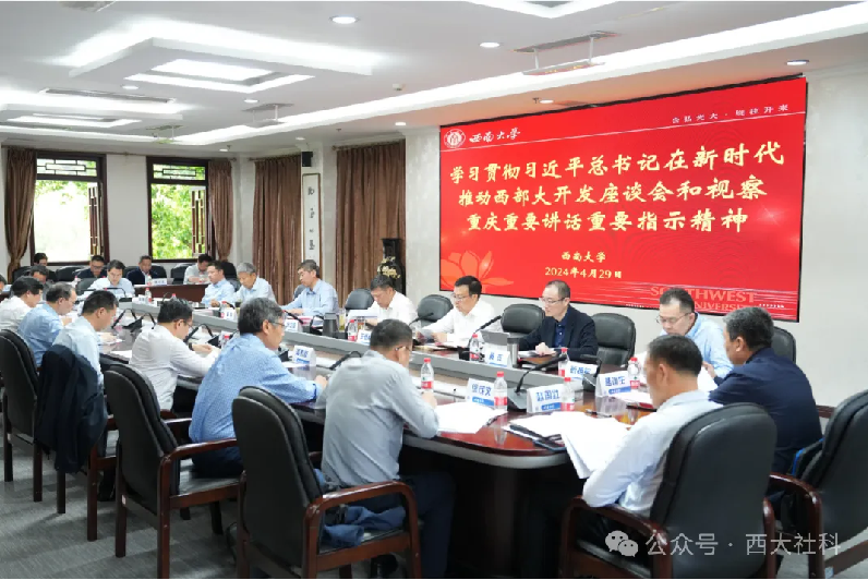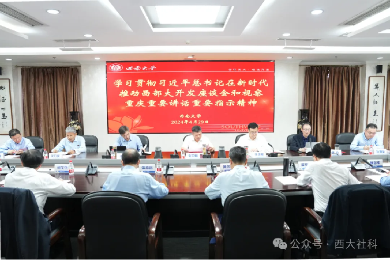为了深入学习贯彻习近平总书记在新时代推动西部大开发座谈会和视察重庆重要讲话重要指示精神,推动各项工作落地见效,4月29日上午,学校组织召开专题座谈会。学校党委书记张卫国,校长、党委副书记王进军,党委副书记潘洵,党委副书记黄杰,专家代表,相关职能部门负责人,人文社科二级单位负责人,重庆市人文社科重点研究基地负责人参加座谈会。会议由黄杰主持。