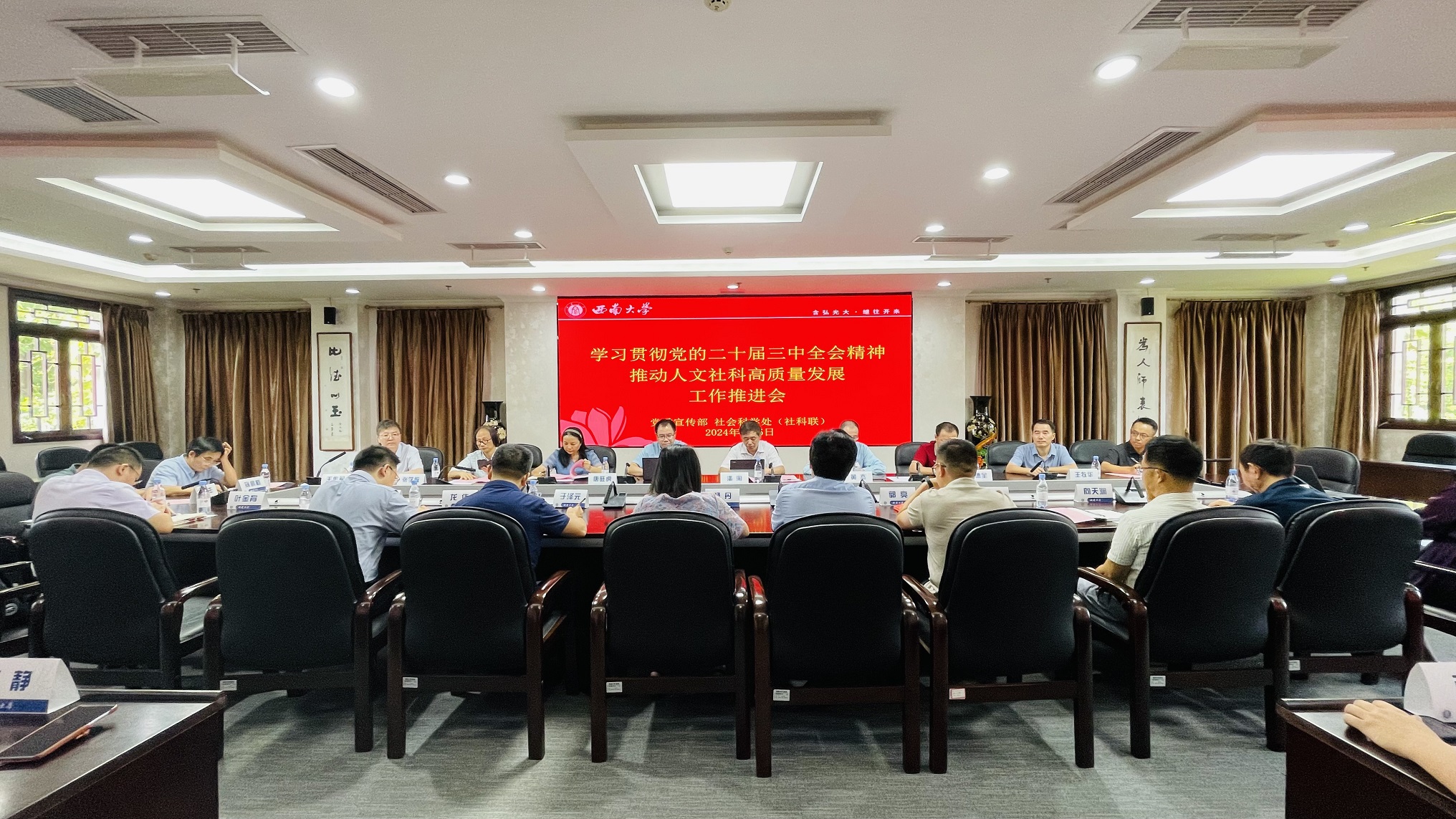 9月5日上午,bw必威西汉姆联官网党委宣传部、bw必威西汉姆联官网处共同举办“学习贯彻党的二十届三中全会精神 推动人文社科高质量发展”工作推进会。学校党委副书记潘洵、黄杰,重庆市社科联规划评奖办主任唐旺虎,社科处处长王牧华出席会议,各文科单位主要负责人和分管科研领导、人文社科国家重点科研平台负责人参加会议。会议由bw必威西汉姆联官网处副处长王作军主持。