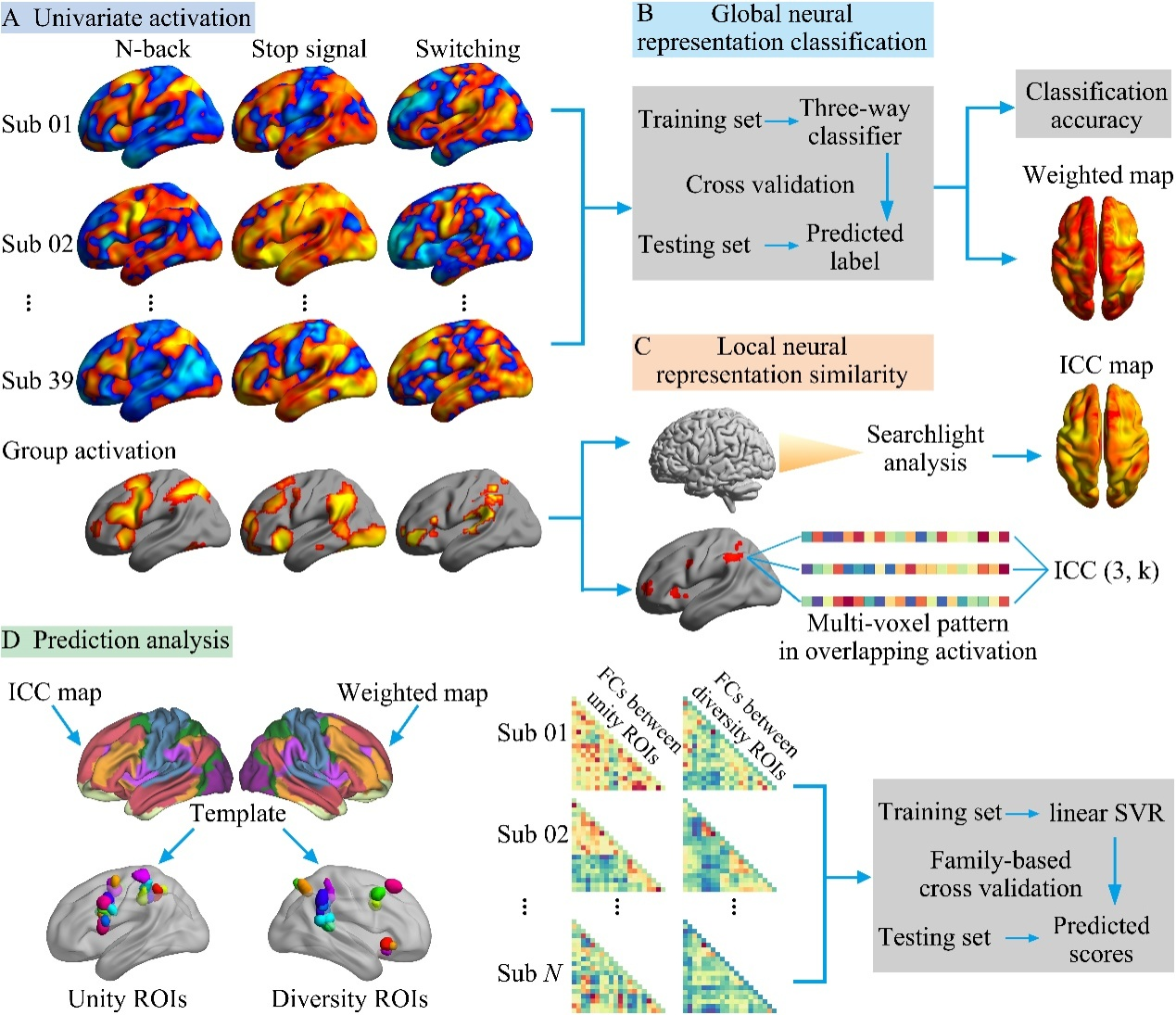 研究结果显示,在全局水平,全脑激活模式可以有效区分不同的EFs任务;在局部水平,虽然三个任务在大多数的共激活脑区表现出较低的表征相似性,但左侧额下联合皮层(inferior frontal junction)例外,该区域的神经表征在三个任务之间高度相似,该结果也得到全脑探照灯分析的验证。此外,考虑到EFs与智力的密切联系,如果上述确定的EFs表征区域是有效的,那么这些区域的功能特征也与智力有关。本研究利用另一个大型独立样本证实了这些区域构建的功能网络对智力有显著的预测效果。这些发现不仅在EFs的统一性与多样性理论框架下揭示了EFs的神经表征特点,还为确定多种EFs涉及的共同认知功能提供了机制性解释,也可为EFs神经刺激和干预训练提供潜在的大脑靶点。