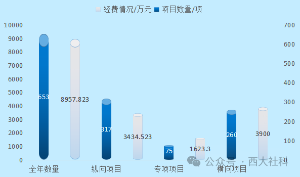 纵向项目中,获国家社科基金项目65项(其中年度项目立项数量创历年新高,立项数量位居全国高校并列第5位)。从立项级别来看,其中重大4项(含重大委托),重点项目4项(包含研究阐释党的二十大精神专项重点项目1项),一般项目52项,青年项目5项。