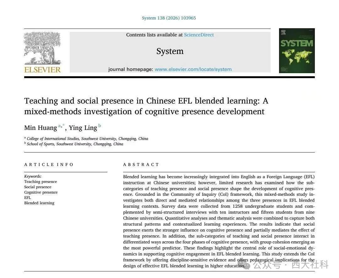 近日,外国语学院黄敏副教授以第一作者和通讯作者身份撰写的论文《中国EFL混合式学习中的教学存在与社会存在:认知存在发展的混合方法研究》(Teaching and Social Presence in Chinese EFL Blended Learning: A Mixed-Methods Investigation of Cognitive Presence Development)在国际语言学领域顶级期刊《系统》(System)上公开发表。